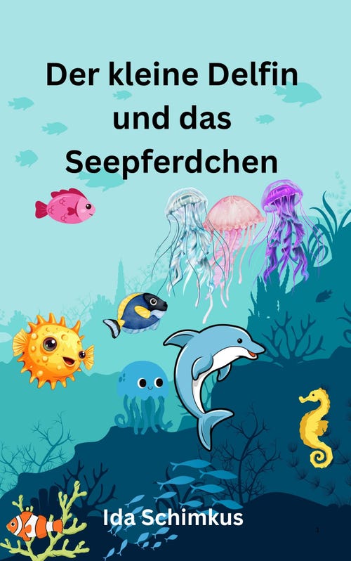 Der kleine Delfin sucht Freunde, aber erst findet er keine. Dann findet er welche: ein Seepferdchen, eine Qualle und ein Fisch.